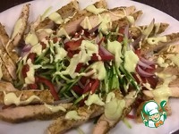 Овощи выложить в середину блюда Вокруг выложить кусочки курицы Сверху полить соусом |