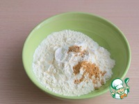 Соединить в миске сухие ингредиенты: муку (3 стакана), кардамон (1/2 ч. ложки), мускатный орех (1/2 ч. ложки). Смесь хорошо размешать. |