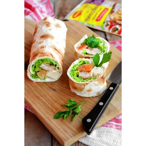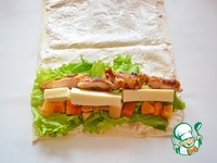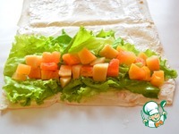 На один край лаваша положите листья салата и кусочки консервированных фруктов |