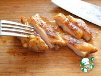 Далее положите нарезанный брусочками адыгейский сыр и нарезанную курицу |