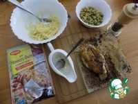 В салатник выкладываем пасту, зелёный горошек. Куриную грудку режем произвольно, как вам больше нравится. |