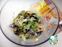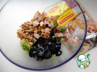 В миску добавить курицу, сельдерей, виноград, листья салата, нарубленные орехи. Перемешать. |