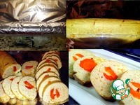 Массу закрутила в фольге рулетом. Положила на противень и поставила в разогретую до 200 градусов духовку. Выпекала 45 минут. Рулет нарезала кольцами. |
