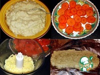 Морковь нарезала колечками и воткнула вдоль всей массы. Измельчила сыр и насыпала его сверху моркови. |