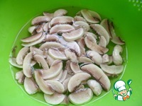 Ножки удалить, они пригодятся для жарки в другое блюдо, заморозьте их. Нам нужны шляпки, их нужно нарезать пластиками. |