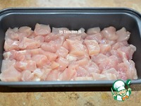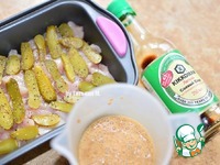 На курицу - полоски огурчиков, посыпать перцами; Соевый соус смешать с бульоном, сметаной, сиропом (если нет бульона под рукой, можно использовать кипяченую воду); |