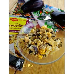 Описание: Куриное мясо хорошо сочетается с баклажанами жареными, салат можно использовать в повседневном меню для разнообразия.
