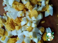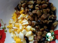 В салатницу сложить яйца, баклажаны. Затем филе нарезанное, лук нарезанный мелко (ошпаренный кипятком), посолить, заправить майонезом. |