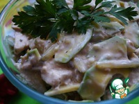 Описание: Сытный и полезный салат из нежного филе куриной грудки с авокадо и маринованными огурчиками, заправленный пикантной заправкой. А главное, что этот чудесный салат никак не отразится на вашей фигуре) Заходите и угощайтесь!