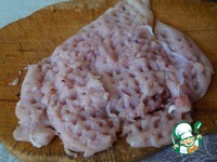 Одно крупное филе куриной грудки промыть и слегка отбить. |