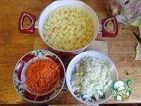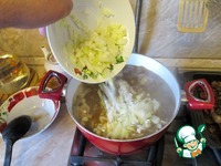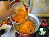 6. Как только картошка закипела отправляем лук и морковь в кастрюльку, отправляем свежие, не пассированные.