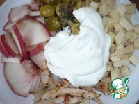 Куриное филе с луком переложить в салатник, добавить нарезанный персик, сыр, оливки. |