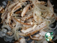 В сковороду к луку добавьте нарезанное куриное филе, перемешайте. Выключите огонь и остудите. |