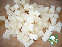 Твердый сыр нарезать кубиками среднего размера. |