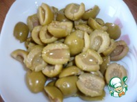 Оливки разрезать пополам. |