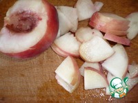 Персик помыть, удалить косточку, а мякоть нарезать тонкими ломтиками. |