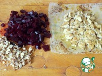 Свеклу нарезать мелким кубиком. Орехи измельчить на кусочки. Чеснок натереть. Остывшую грудку порезать средним кубиком. |