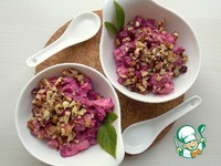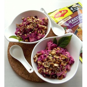 В чашу сложить куриную грудку, свеклу, чеснок и йогурт, перемешать. Положить в порционные тарелки и посыпать рубленными орехами. |
