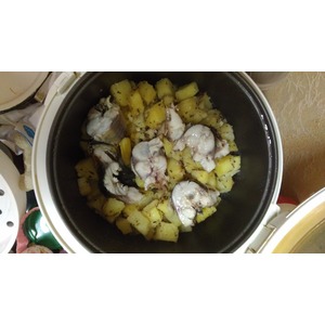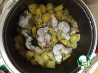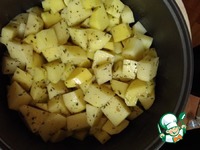 Выкладываем картофель, выливаем масло. Перемешиваем. Ставим на режим "Тушение" на 30 минут. Если вы готовите в духовке, ставим на 30-40мин. Всё зависит от мультиварки/духовки. |