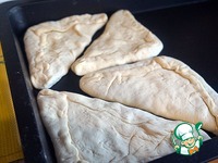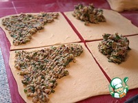 Тесто (внизу – дрожжевое, сверху – бездрожжевое) раскатать довольно тонко в прямоугольный блин. Разрезать блин на четыре части, выкладывать на каждую часть начинку так, как на фото. |