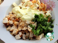Остывшую грудку нарезать кубиком, добавить колбасный сыр и кинзу. Перемешать с домашним майонезом. |