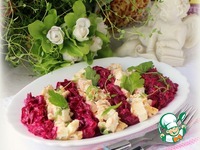 Выложить а блюдо полосками, чередуя свекольный и куриный салат. Приятного аппетита. |