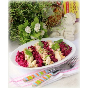 Описание: Салат, состоящий из двух разных салатов, выложенный на тарелку в виде полосок, придаст праздничный вид Вашему столу. Гармоничное сочетание всех ингредиентов создаст неизгладимое впечатление у Ваших гостей.