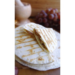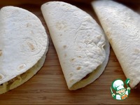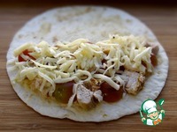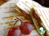 Кулинарной кистью нанести на тортилью тонкий слой горчицы. На одну половину лепешки выложить треть филе, винограда и сыра. |