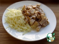 Мясо нарезать кубиками, сыр натереть на крупной терке. |