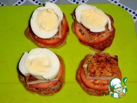 Разложить баклажаны с чесноком. По вкусу можно посолить яйцо или помидор. Украсить зеленью закуску и подать к столу. |