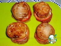 Помидор порезать кружочками. Начинаем собирать закуску. На баклажан положить чеснок, затем помидор. |