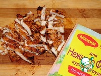 Теплую курицу порезать продолговатыми кусочками. |