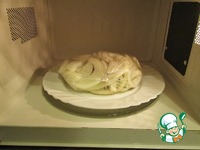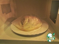 Оставляете отдохнуть его минут на пять, как раз второй кусок прогоните. Через 5 минут опять в микроволновку мясо отправляем, на 3 минуты уже. |