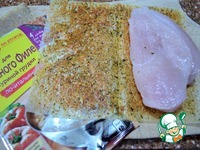 Куриную грудку слегка отбить, выложить на лист от Магги. Прикрыть, прижать рукой. |