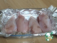 Форму для запекания застилаю фольгой так, чтобы один край фольги можно было завернуть сверху, закрыв филе. На фольгу выкладываю кусочки куриного филе. |
