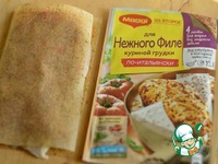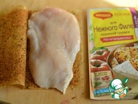 Куриное филе отбить до толщины 1.5-2 см. Развернуть лист приправы MAGGI на второе для нежного филе куриной грудки. Выложить на одну половину филе. |