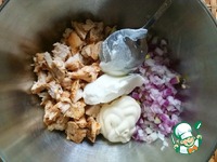 Смешиваем курицу, лук, добавляем йогурт и майонез, соль - по вкусу, и все хорошо перемешиваем. |