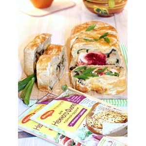 Описание: Вкусный и сытный закусочный пирог с двумя начинками и пикантным, нежным куриным филе.