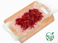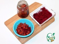 3. Вяленые помидоры нарезать небольшими кусочками. Очищенную свеклу натереть на средней терке и выжать сок. 2 ст. ложки свеклы (без сока) смешать с помидорами. |