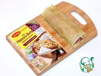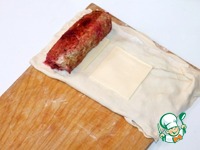 11. Кладем на тесто 2 пластины сыра и курочку, сворачиваем в рулет. Защипываем края. |