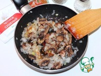 8. Очищенный и мелко порезанный лук обжарить с грибами. Добавить чеснок, паприку, перец и соль. |