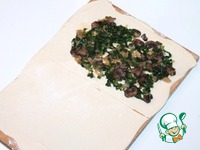 10. Разделочную доску припылить мукой и раскатать 1 пластину теста (в 2 раза). Выложить на одну половину теста начинку и закрыть второй половиной. |