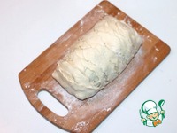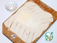 12. Припыляем разделочную доску мукой и раскатываем вторую пластину теста в 1,5 раза. Смазываем середину сливочным маслом, кладем одну пластину сыра и надрезаем край теста на полоски. |