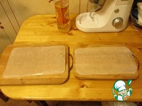Через два часа приступаем к формированию батонов. Вырезаем из пергамента (бумага для выпечки) подложки для батонов. Смазываем их маслом растительным. |