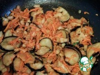 Выложить баклажаны на тарелку, а в сковороду выложить лук, нарезанный кубиками, морковь, натертую на крупной терке и чеснок, нарезанный пластинками. |