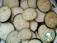 Баклажан нарезать тонкими кружками, посолить и оставить минут на 20 примерно. |