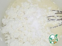 Затем вводим творог, соду и сметану. Тщательно перемешиваем. |