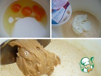 Муку смешать с разрыхлителем, просеять, вводить в массу частями, перемешать. Тесто не крутое, слегка спадает с лопатки. |