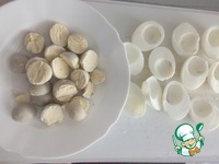 Яйца разрезаем на 2 части, отделяем белки от желтков. |