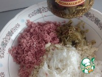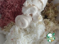 Желтки разминаем вилкой, белки, огурцы и колбасу трем на мелкой терке. Я взяла только 5 белков в паштет, а остальные нафаршировала. |